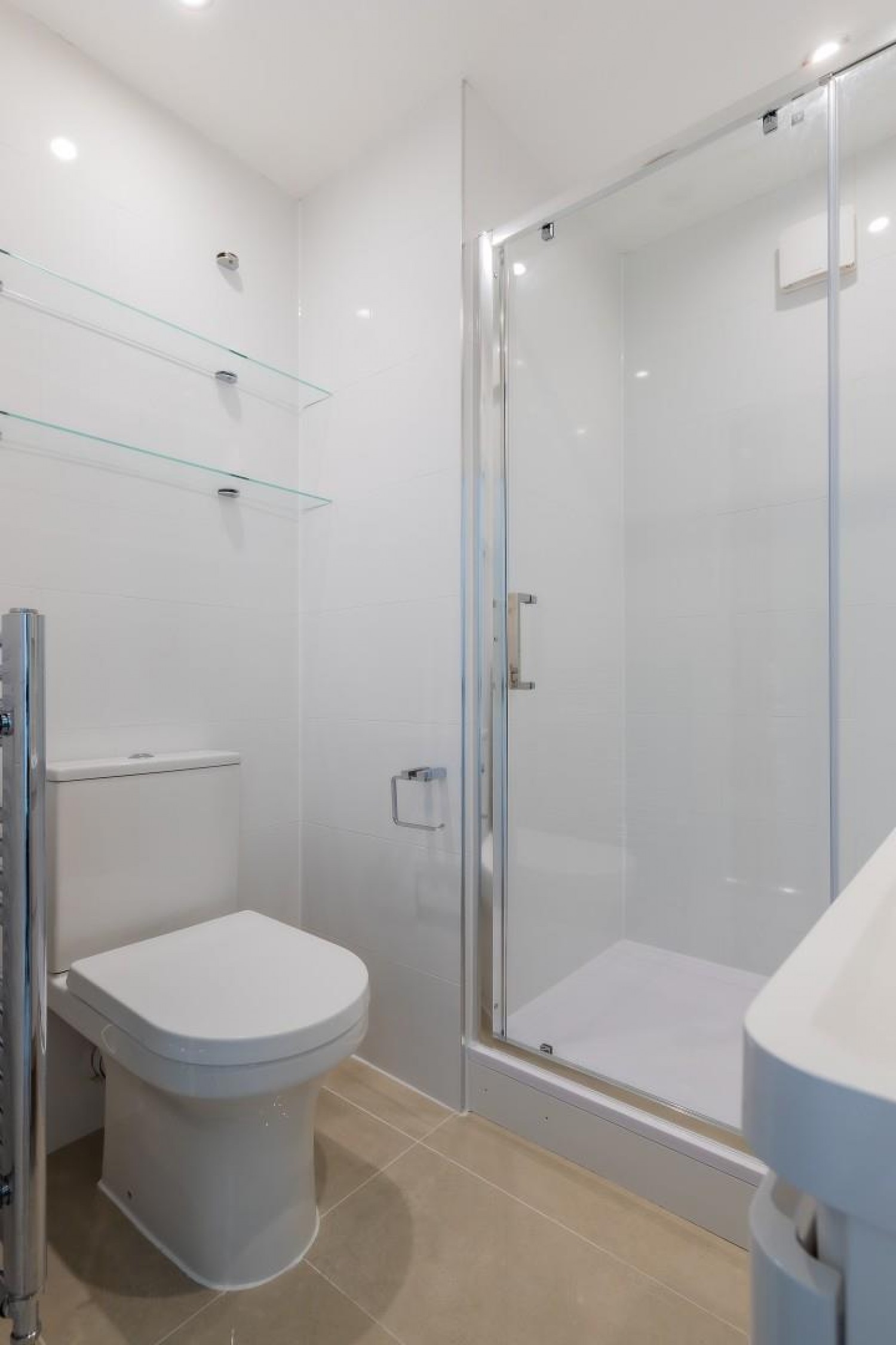 Stylishly appointed modern white suite comprising a double enclosure - mains shower & attachment, floating wall mounted wash hand basin and close coupled wc, tiled walls and porcelain tiled floor, extractor fan, heated chrome towel rail, twin shaver point.