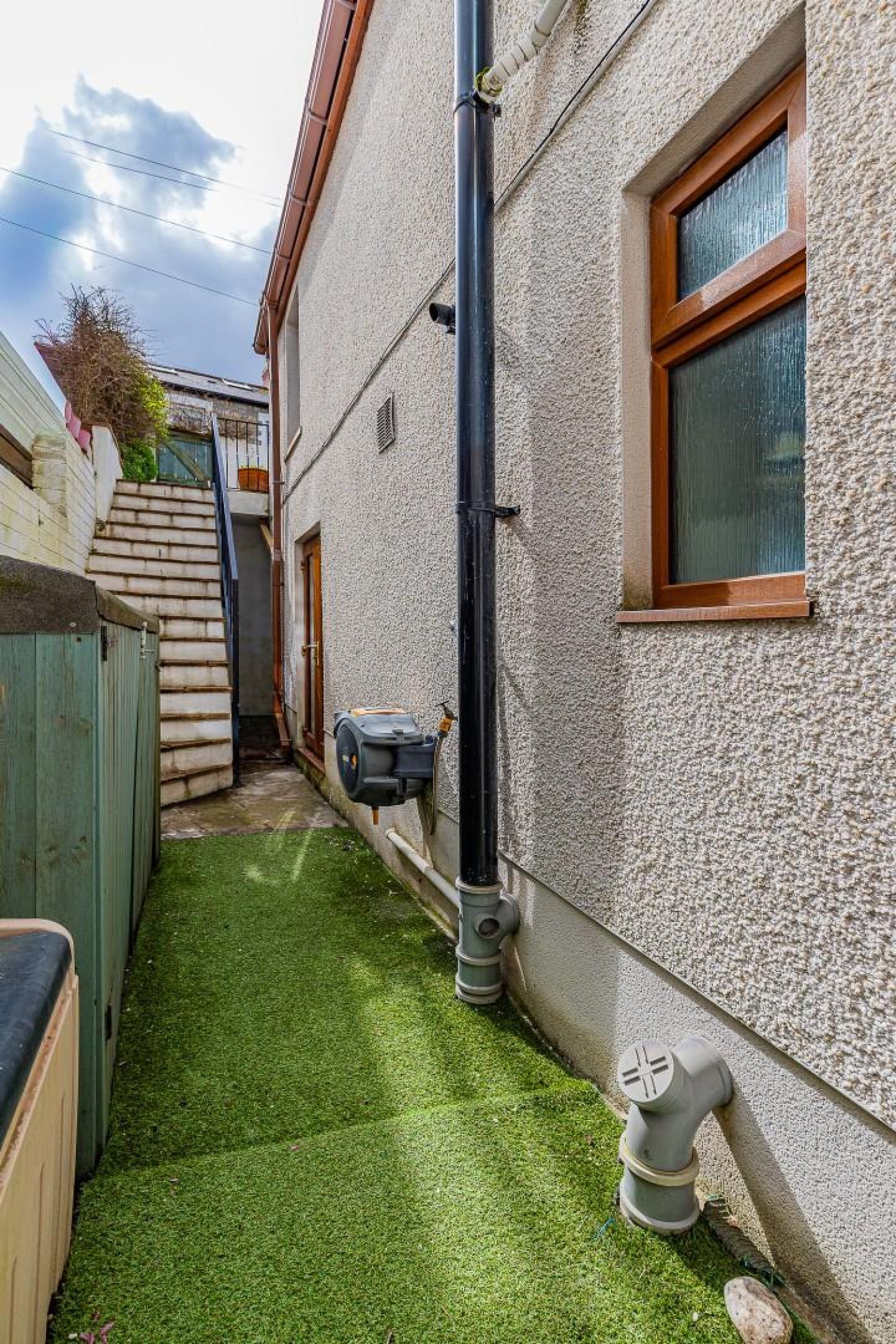Enclosed rear southerly facing garden - paved, boundary wall with gated access into Coronation Terrace, light & tap.