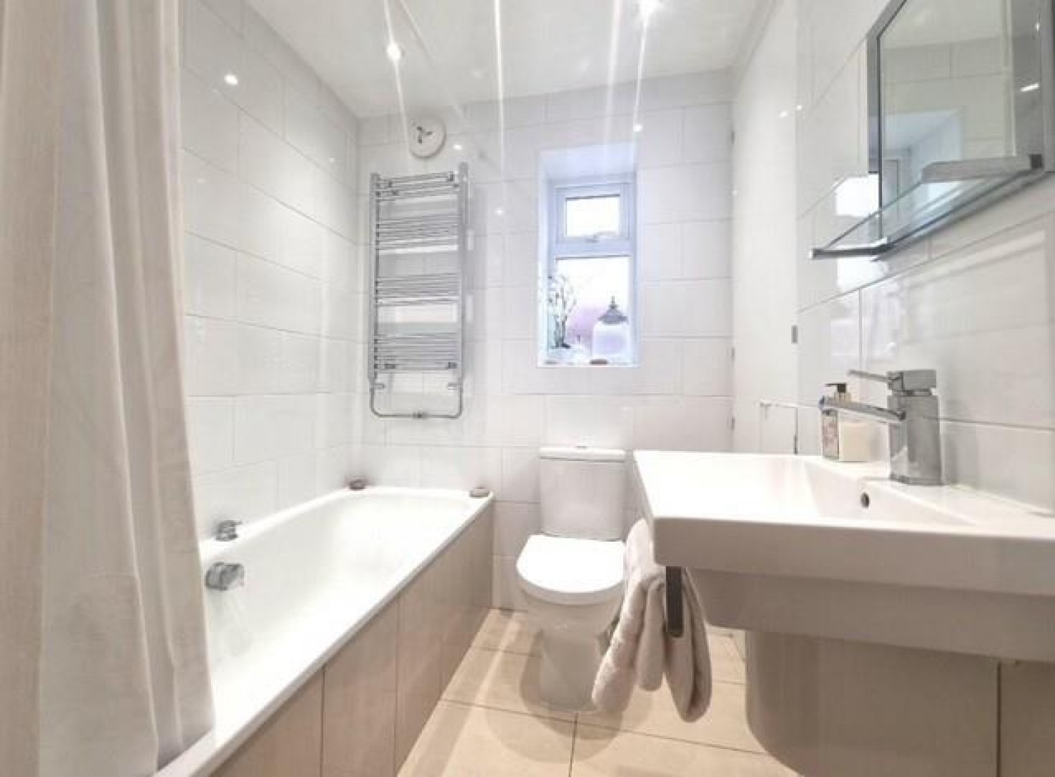 Equally stylishly appointed modern white suite comprising a tile panel double ended bath - mains shower, floating wall mounted wash hand basin and close coupled wc, tiled walls and porcelain tiled floor, extractor fan, heated chrome towel rail, twin shaver point, window to side, corner cupboard housing the gas combination boiler.