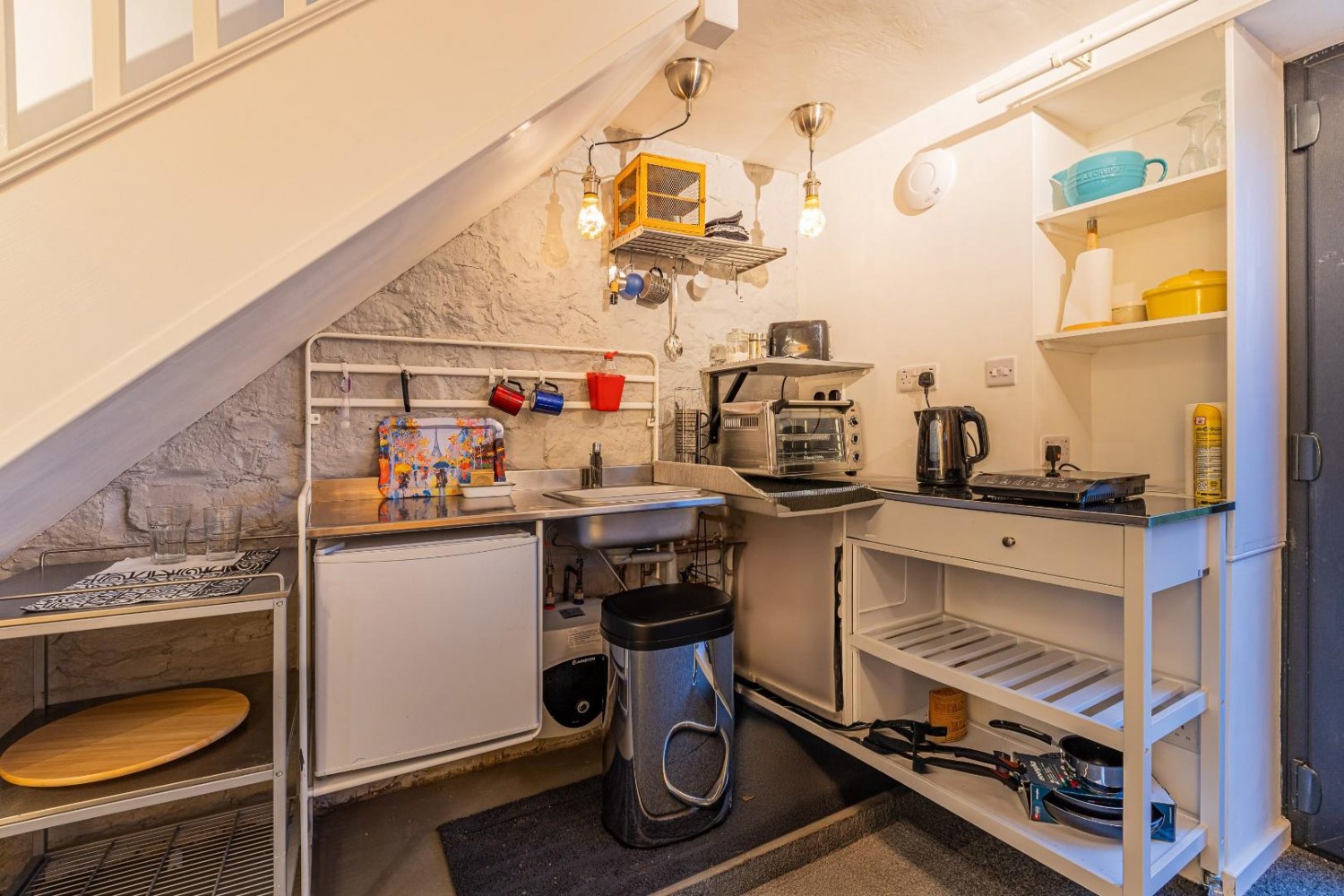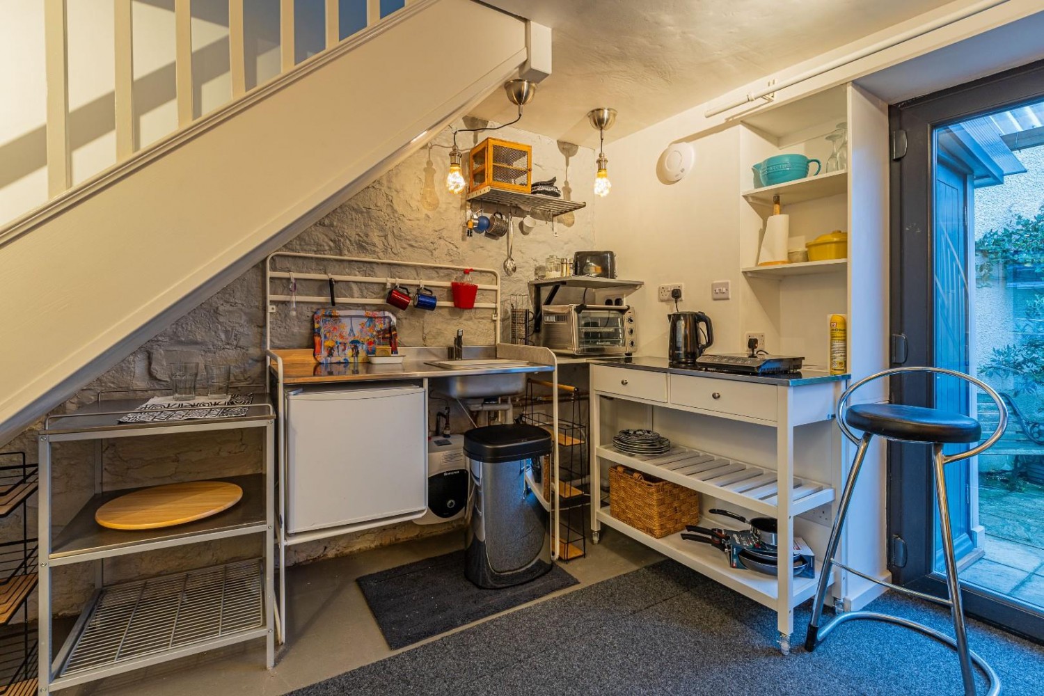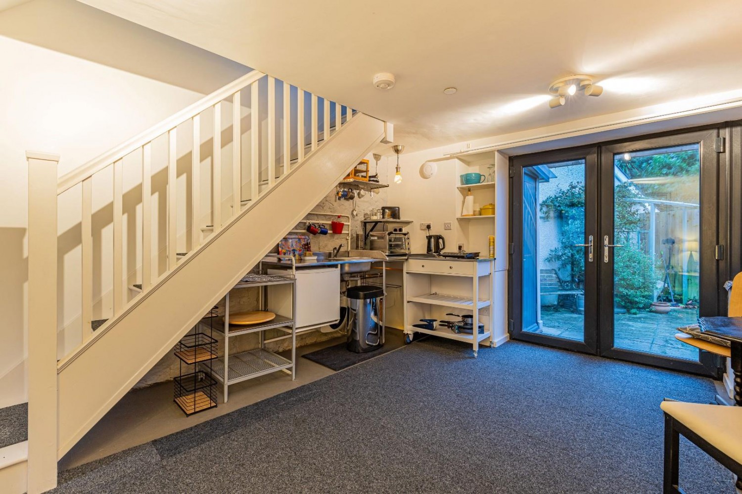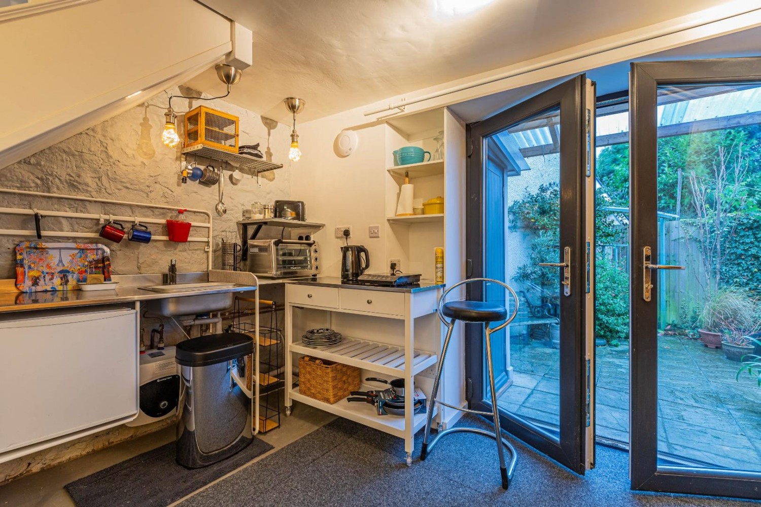 Contemporary open plan living . . . Enter via a half glazed timber door and combining the living space with the kitchen area. At the rear French doors overlooking and leading into the garden with side window plus window to the side of the room. Stairs rise up to the first floor, beneath is the kitchen area with stainless steel sink & drainer with mixer tap and free standing units plus small air fryer oven & portable hob. To the corner of the living room is the cloakroom.