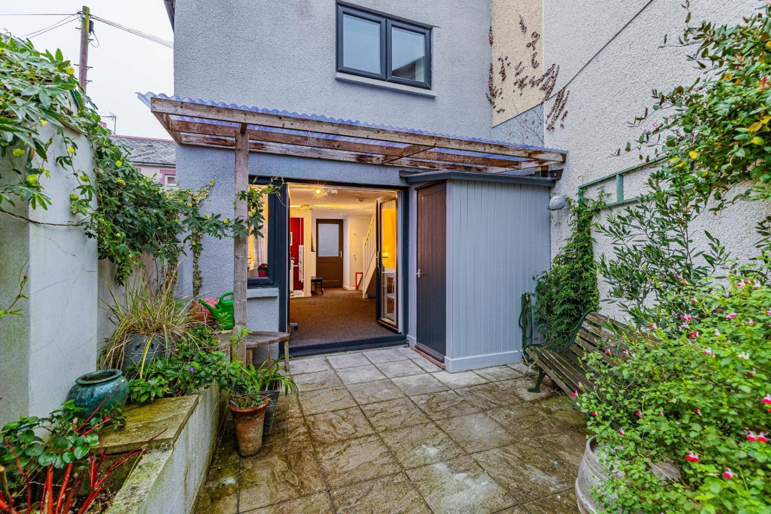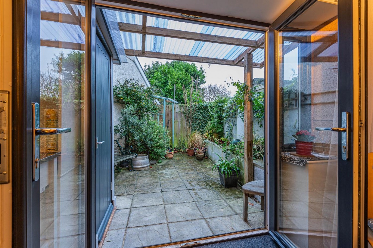 Enclosed courtyard fragrant garden - south facing, boundary wall, paved with raised planters including 2 Jasmine plants, Honey Suckle and an established passion Flower, outside tap, to the far corner a covered upright bike store.