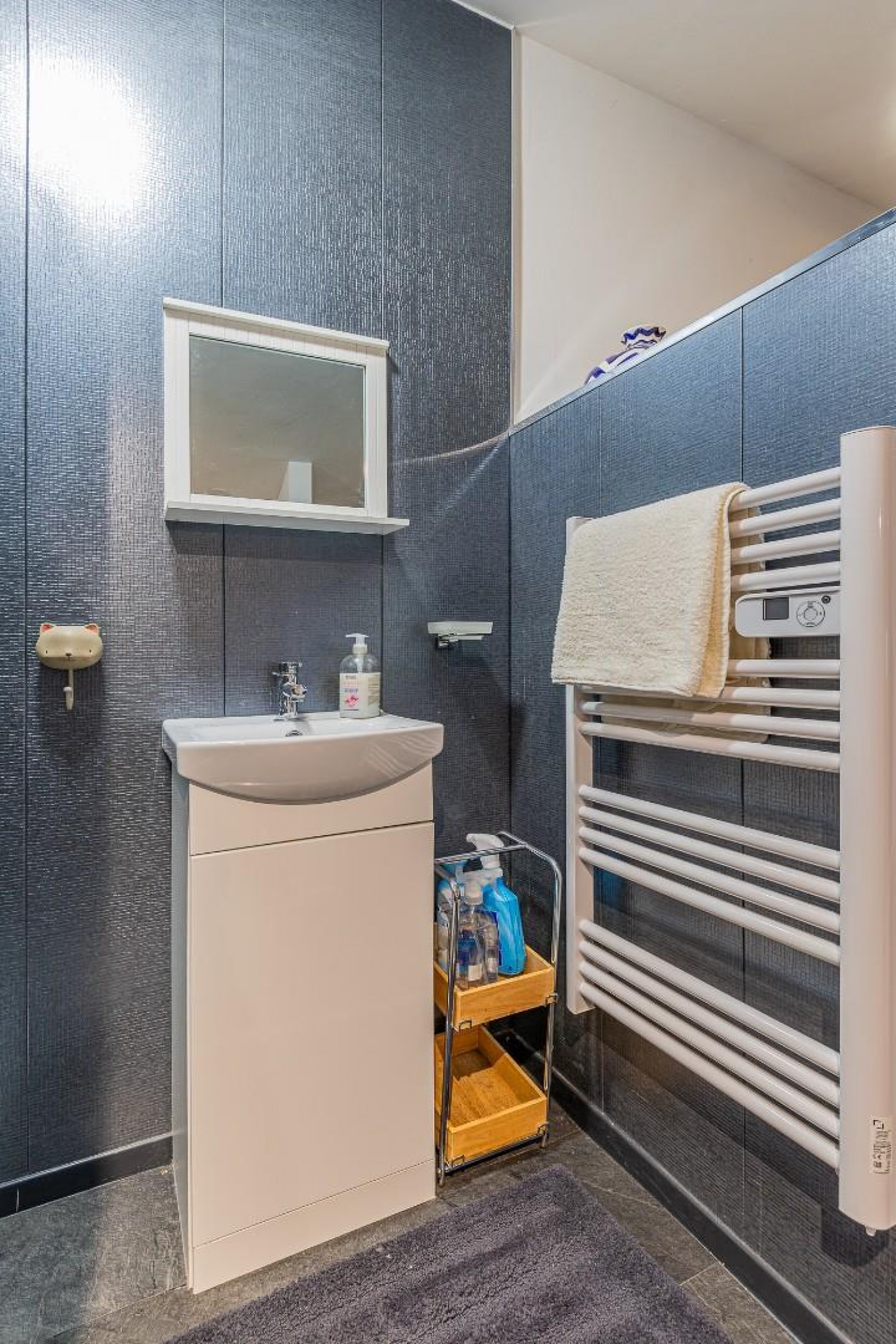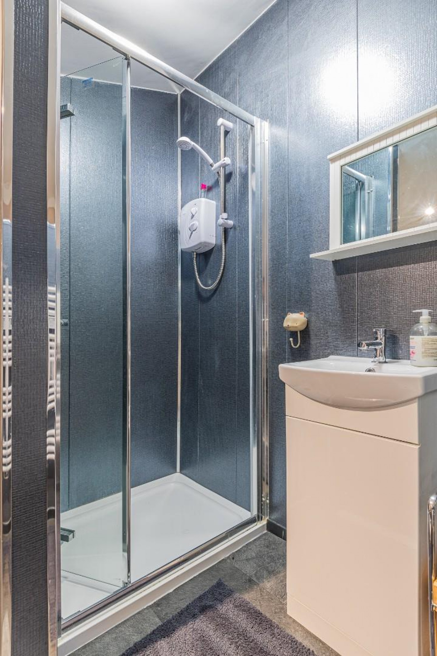 Generous shower cubicle plus vanity wash hand basin, heated towel rail, extractor fan.