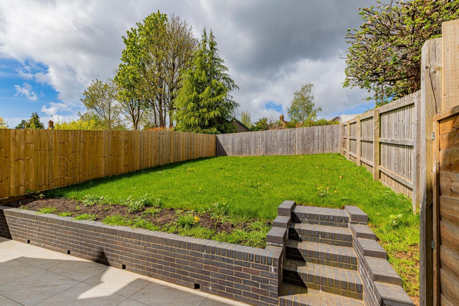 Large patio area and side access. fenced boundary and lawned garden